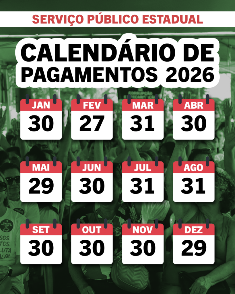 A administração estadual divulgou o calendário de pagamentos mensais para 2026. As datas estabelecem o último dia útil de cada mês para pagamento de servidores ativos, aposentados e pensionistas. Mantenha-se sempre atualizado e, se tiver dúvidas, procure o setor de Recursos Humanos da sua unidade!